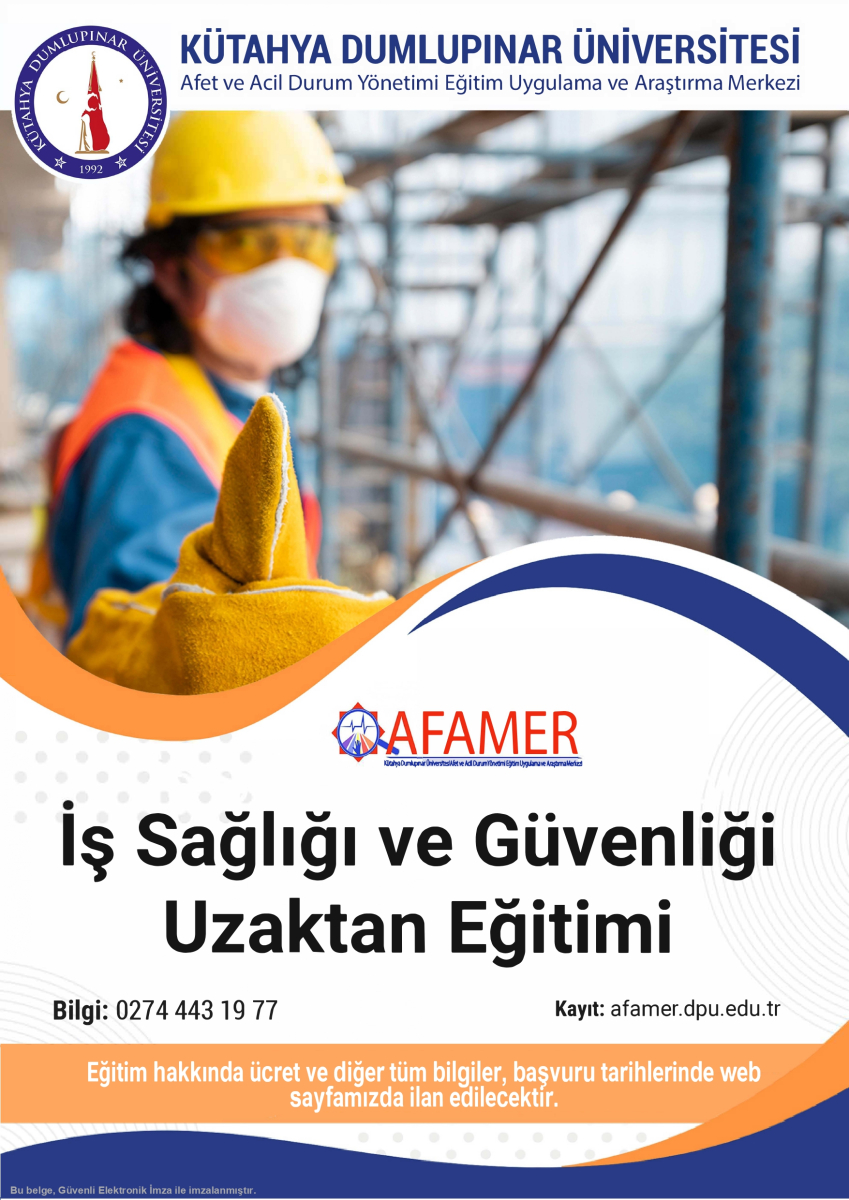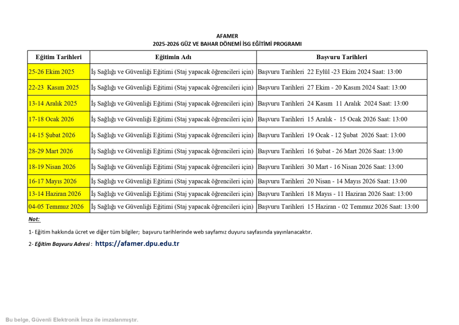 Kütahya Dumlupınar Üniversitesi AFAMER tarafından, staj yapacak öğrenciler için 2025-2026 Güz ve Bahar Dönemi İş Sağlığı ve Güvenliği Eğitim Programı açıklanmıştır.