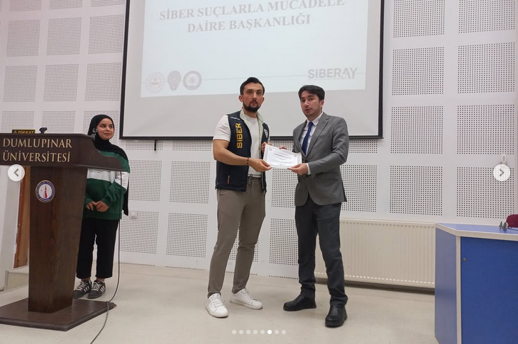 Program sonunda, Emet Meslek Yüksekokulu Müdürü Dr. Öğr. Üyesi Mesut Yazıcı, Polis Memuru Burak Akdoğan’a teşekkür belgesi takdim etti. Konferans, toplu hatıra fotoğrafı çekimiyle sona erdi.