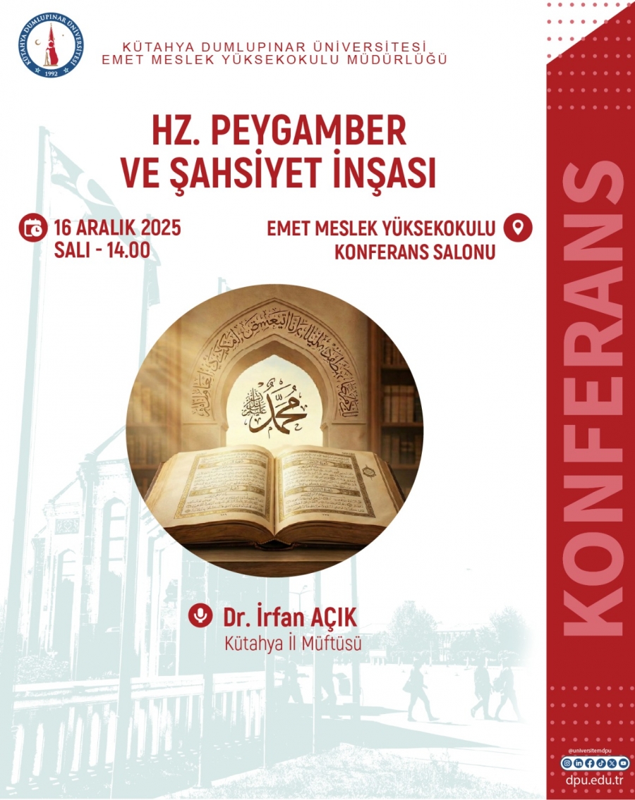 Üniversitemizin Emet Meslek Yüksekokulu tarafından düzenlenen Kütahya İl Müftüsü Dr. İrfan Açık’ın konuşmacı olarak katılacağı Hz. Peygamber ve Şahsiyet İnşası başlıklı etkinlik, 16 Aralık 2025 Salı günü saat 14.00'te Emet Meslek Yüksekokulu Konferans Salonu'nda gerçekleştirilecektir.