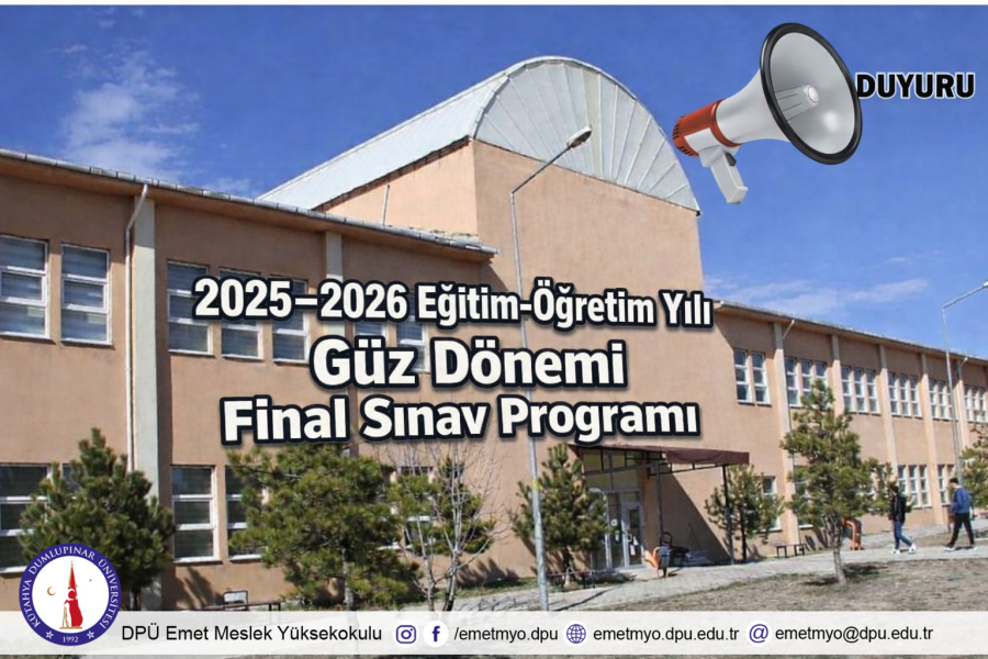 Meslek Yüksekokulumuz 2025–2026 Eğitim-Öğretim Yılı Güz Dönemi Final Sınav Programı, Meslek Yüksekokulumuzun web sayfasında yayımlanmıştır.