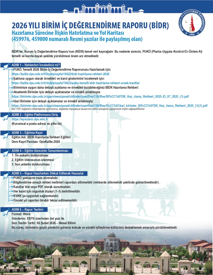 Üniversitemizde yürütülmekte olan 2026 Yılı Birim İç Değerlendirme Raporu (BİDR) hazırlık süreci kapsamında hazırlanan bilgilendirici dokümanlara kolaylıkla erişilebilmesi ve sürecin etkin şekilde yürütülmesine katkı sağlanması amacıyla 2026 BİDR Broşürü hazırlanmıştır.