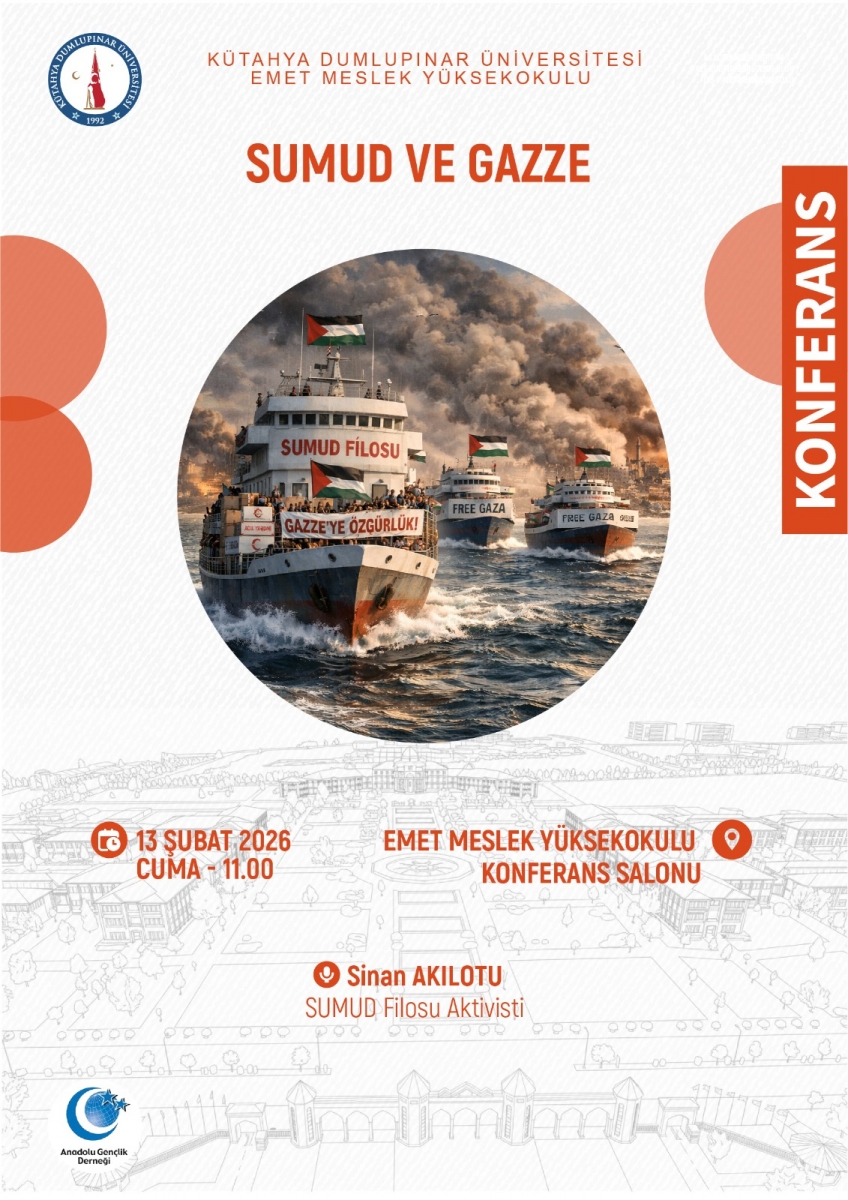 Anadolu Gençlik Derneği Emet Temsilciliği tarafından düzenlenen Sinan Akılotu’nun konuşmacı olarak katılacağı Sumud ve Gazze başlıklı etkinlik, 13 Şubat 2026 Cuma günü saat 11.00'de Emet Meslek Yüksekokulu Konferans Salonu'nda gerçekleştirilecektir.
