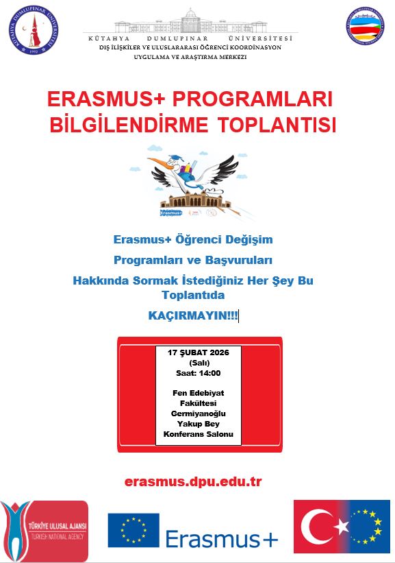 Erasmus+ Değişim Programı kapsamında Öğrenci Öğrenim ve Staj faaliyetlerine yönelik başvuru dönemi bilgilendirme toplantısı 17 Şubat 2026 saat: 14:00'da Fen Edebiyat Fakültesi Germiyanoğlu Yakup Bey Konferans Salonu'da yapılacaktır.