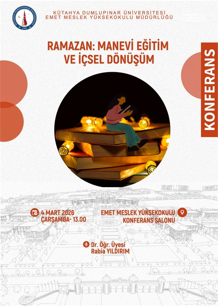 Üniversitemizin Emet Meslek Yüksekokulu tarafından düzenlenen Dr. Öğr. Üyesi Rabia Yıldırım’ın konuşmacı olarak katılacağı Ramazan: Manevi Eğitim ve İçsel Dönüşüm başlıklı etkinlik, 4 Mart 2026 Çarşamba günü saat 13.00'te Emet MYO Konferans Salonu'nda gerçekleştirilecektir.