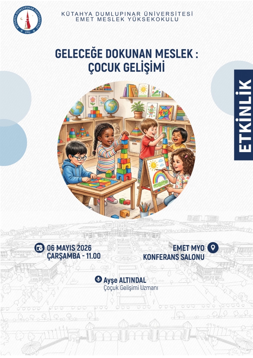 Üniversitemizin Emet Meslek Yüksekokulu tarafından düzenlenen Çocuk Gelişimi Uzmanı Ayşe ALTINDAL’ın konuşmacı olarak katılacağı Geleceğe Dokunan Meslek: Çocuk Gelişimi başlıklı etkinlik, 6 Mayıs 2026 Çarşamba günü saat 11.00'de Emet MYO Konferans Salonu'nda gerçekleştirilecektir.